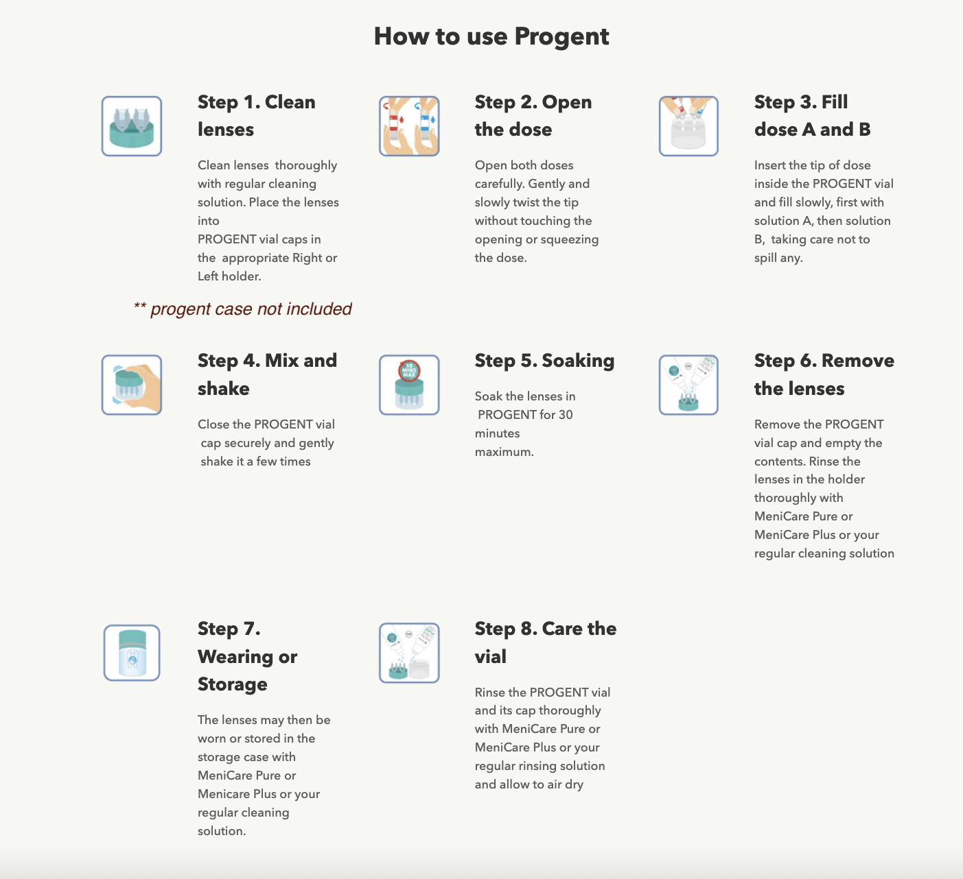 • Soak the lenses in Menicon Progent for 30 minutes. DO NOT soak longer than that. Lens discoloration may occur but this will not affect the lens quality.